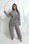 Ensemble à la coupe structurée et moderne, composé d’une veste ceinturée et d’un pantalon fluide. Il offre une allure élégante et affirmée, idéale aussi bien pour un look de journée que pour une tenue plus habillée. Taille unique. Composition : 95% polyester, 5% élasthanne.